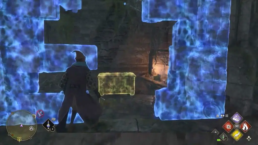 Use revelio spell to see the movable wall. Head inside the movable wall to open the chest.