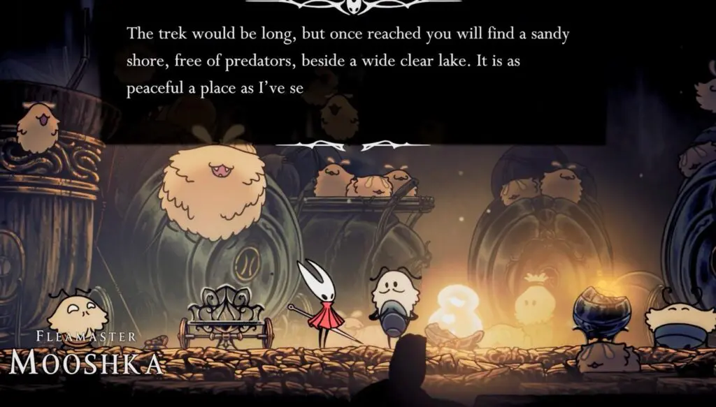 Once the main story is complete, head to the Putrified Ducts and interact with the Harp at the end of the area. Here, the player will tell the Harp that the Fleamaster and caravan are looking for a safe space near the lake.