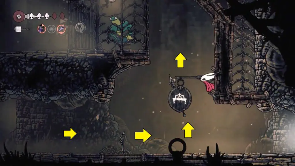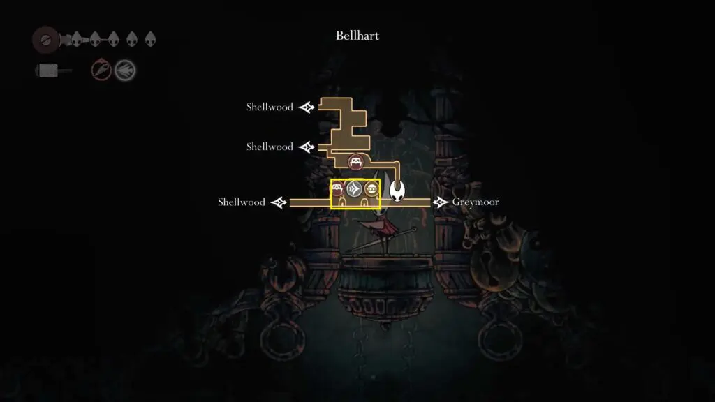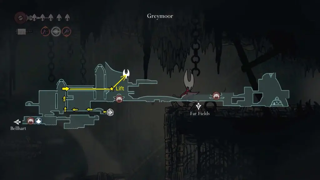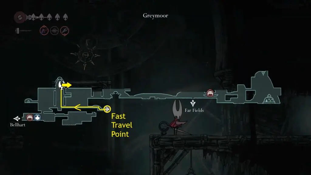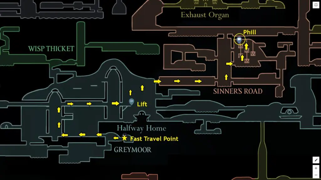 To find Courier Pill, fast travel to Greymoor. From the teleport station, move to the left side of the area. This path will take you through a vertical section where you need to use the Wall Cling ability on spikes and platforms to keep moving upward. Refer to the path shown on the map.