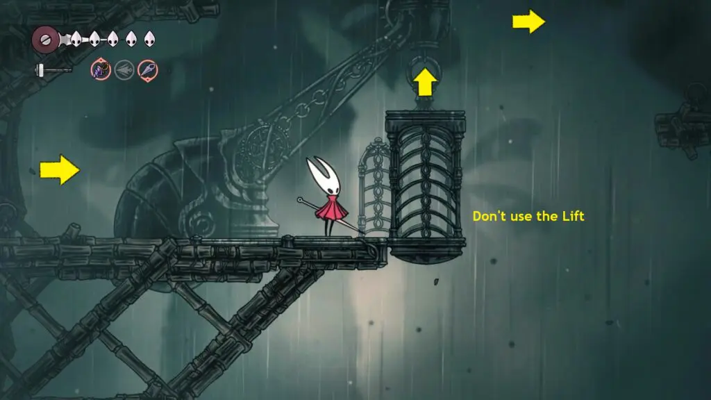 Next, head right into a new section. Along the way, you’ll encounter a lift (Elevator). Don’t go inside it. Instead, use it to climb to the top platforms and continue further up.