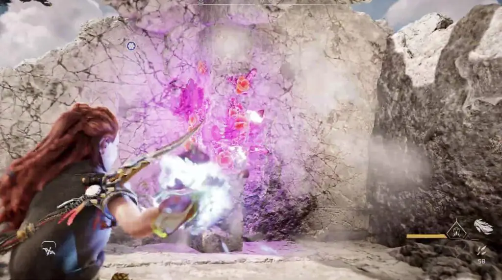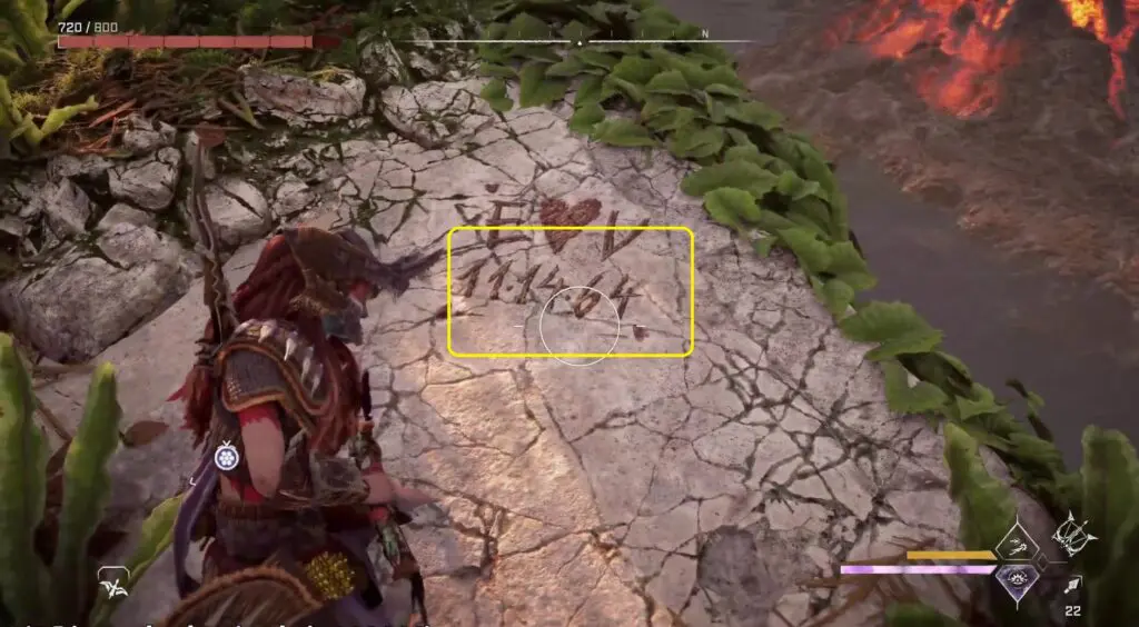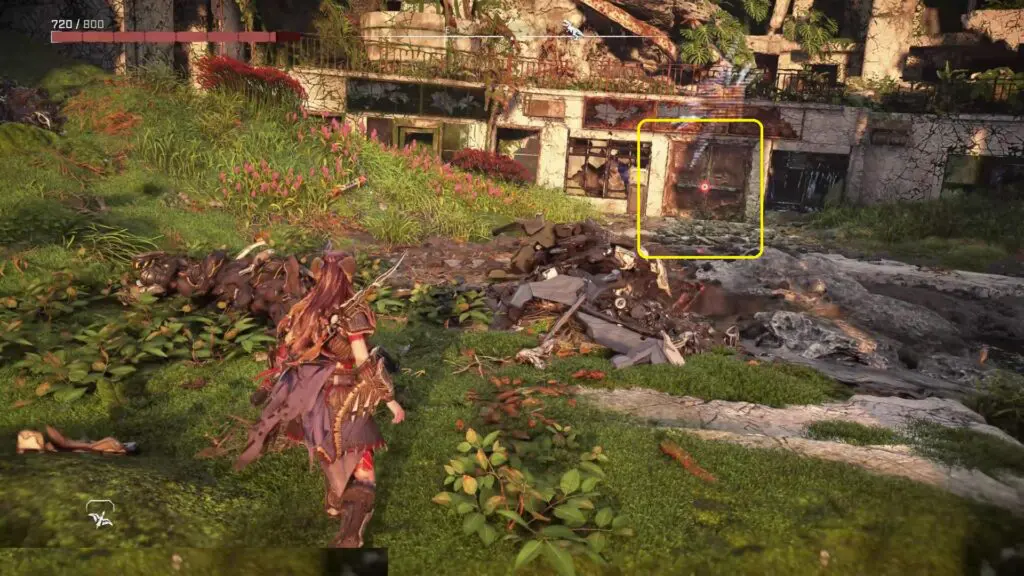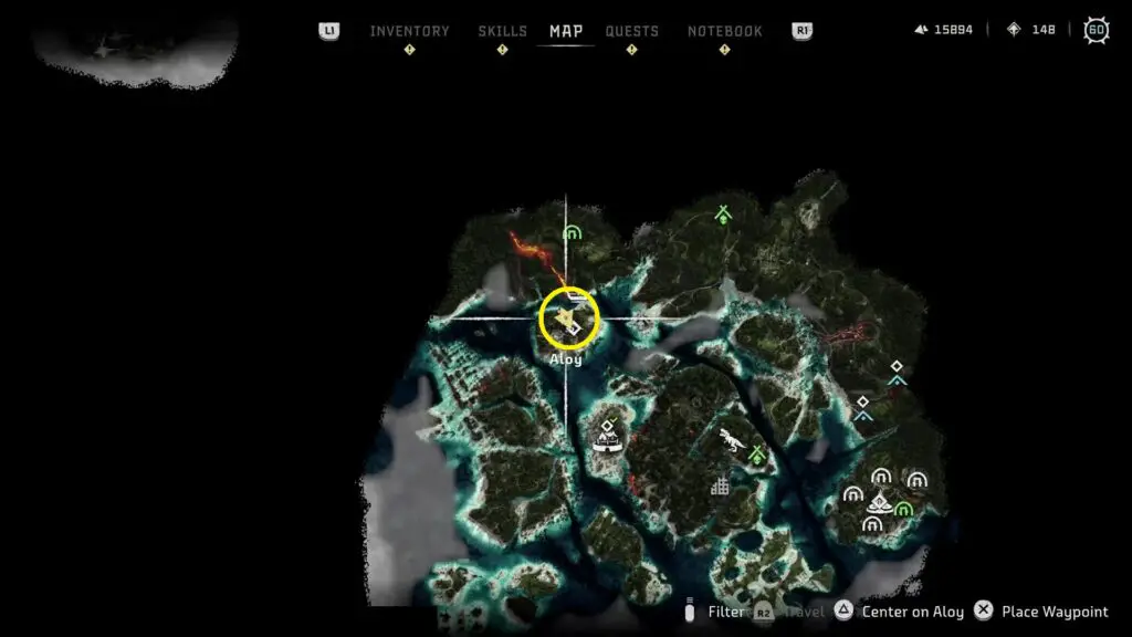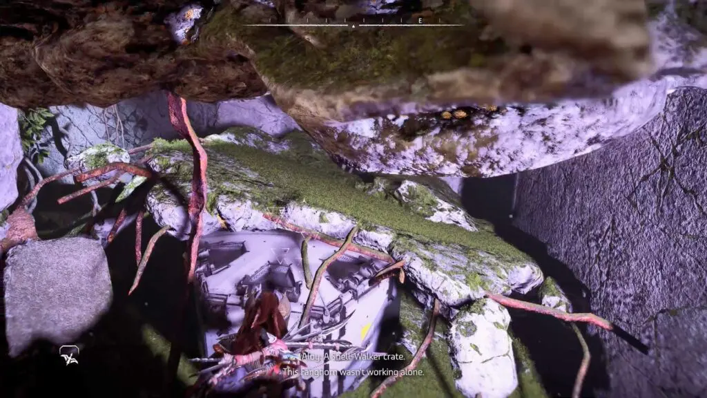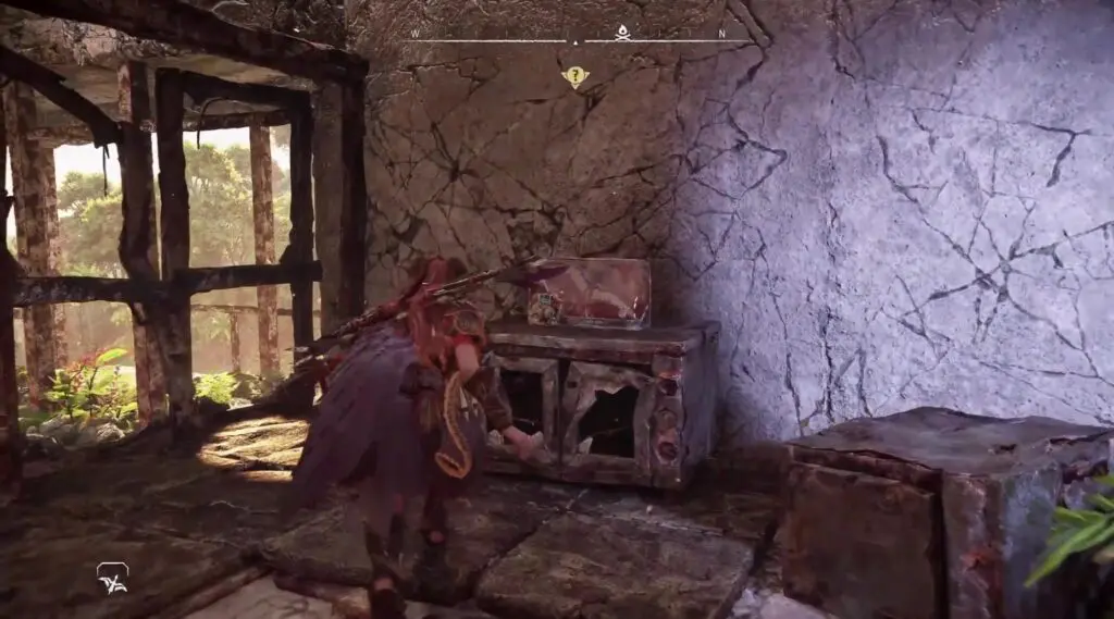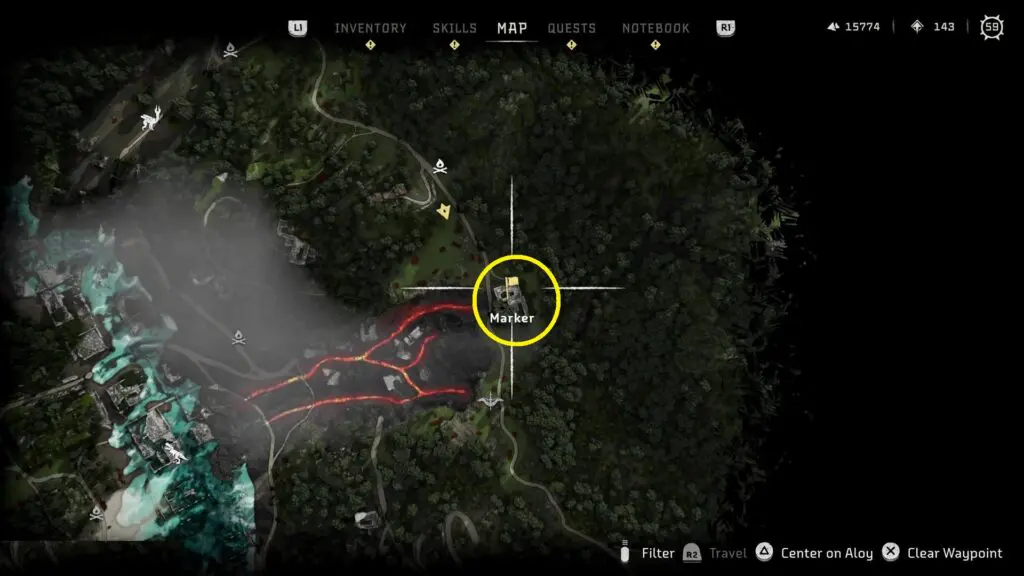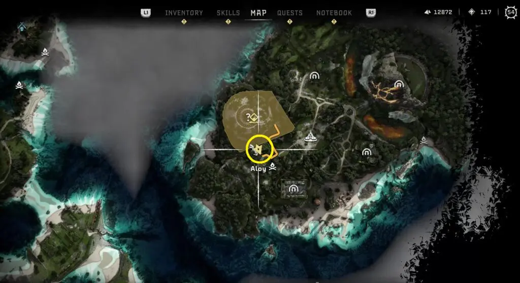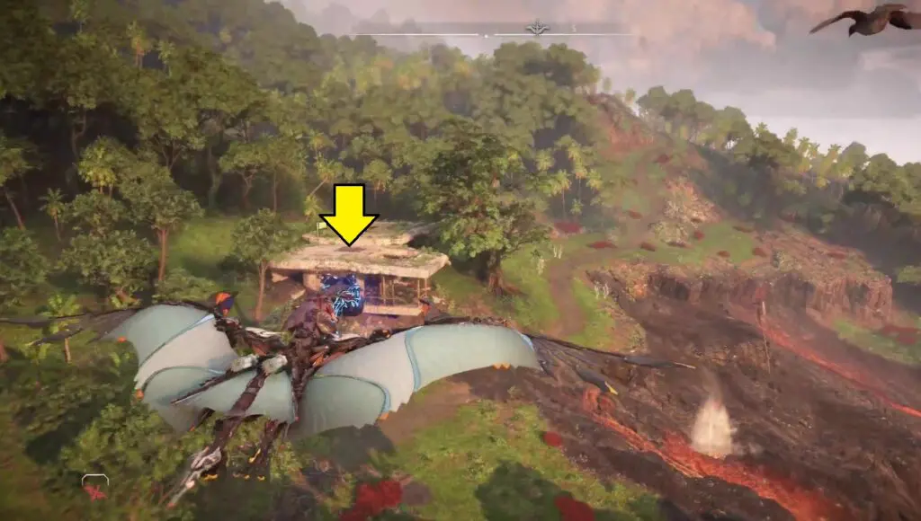 The first figurine is on the east side of the island. Once here, examine the Fire Fanghorn’s carcass. Then cast your Pullcaster at the rusty beams to pull it open.