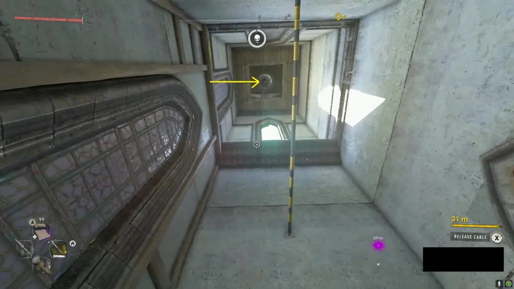 Then jump down to the bottom floor as shown in the picture below. Here, you will find a green terminal. Pull the cable from the terminal.