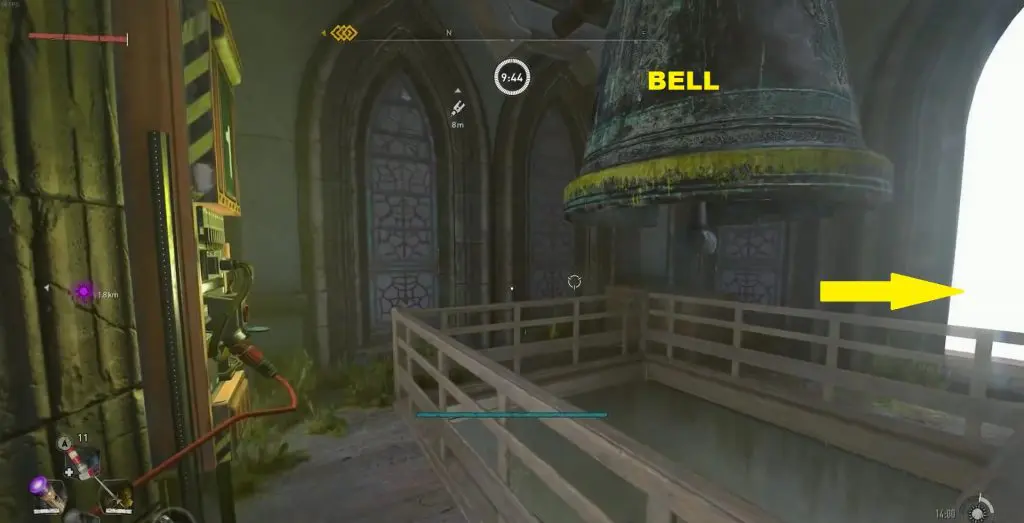 Then go to the upper floor of the church with the big bell as shown in the picture below. On this floor, you will find a red terminal. Insert the cable in the red terminal.