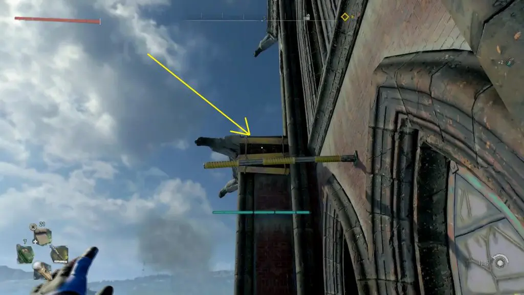 When you have climbed to the top of the rails, turn around and use the rod to jump to the platform up ahead as shown in the picture below.