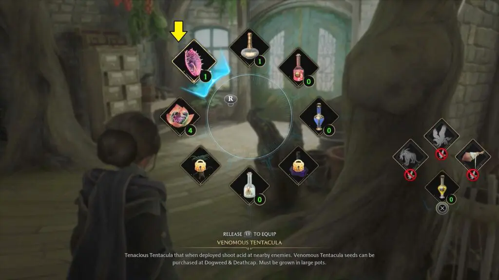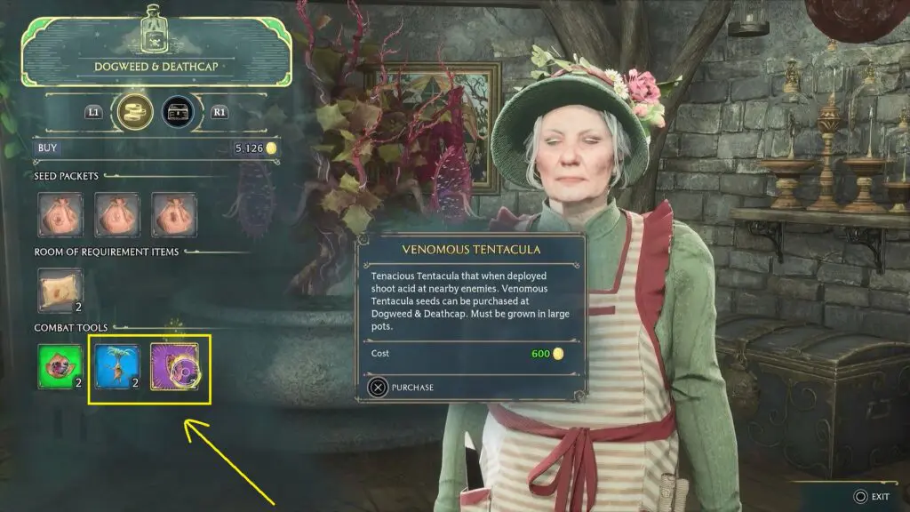 Here you can buy Venomous Tentacle for 600 Galleons and a Mandrake for 500 Galleons. Mandrake is needed for the next objective. Don’t bother buying them as seeds, the Combat Tools will be enough.