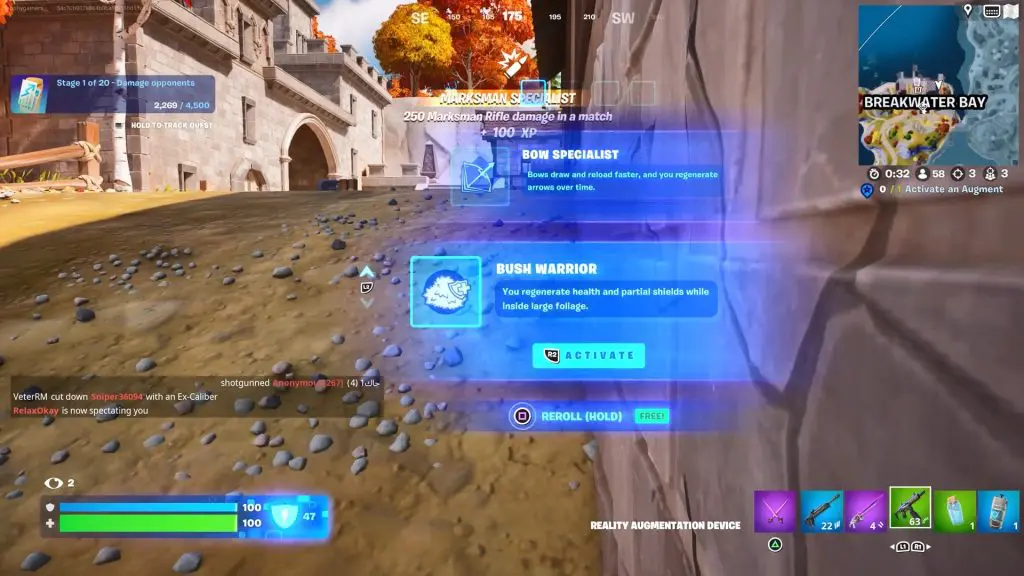Players who survive storm phases and avoid elimination in a Battle Royale round will get Augments. When you reach the time interval where Augments are awarded to players, you will automatically receive two of them, with the option to reroll any that you don’t like. Since these are temporary, a specific one cannot be used in another game as it applies to the same match the player redeems it in.