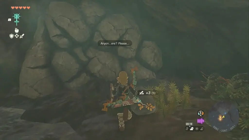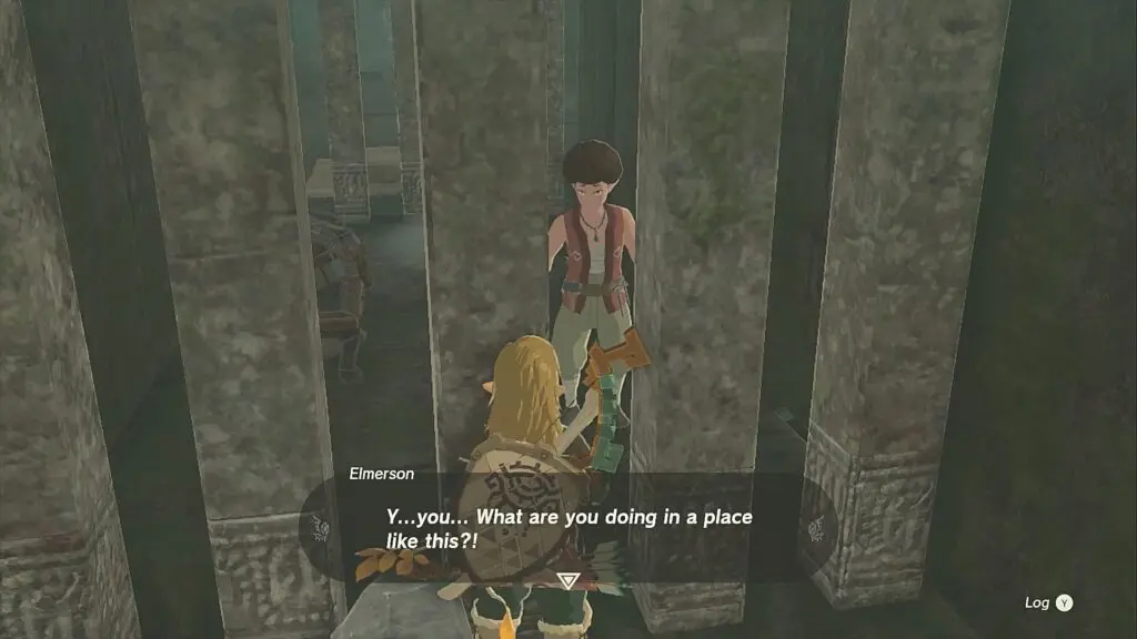 There you will find a rock wall as shown in the picture below. Attach a sword with a boulder there to make a hammer. Then use the hammer to break the rocks. Proceed ahead and talk with the NPC named Elmerson behind the bars as shown in the second picture below. He will ask you to free him.