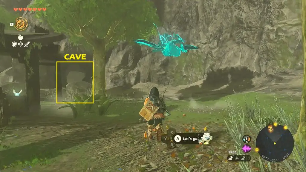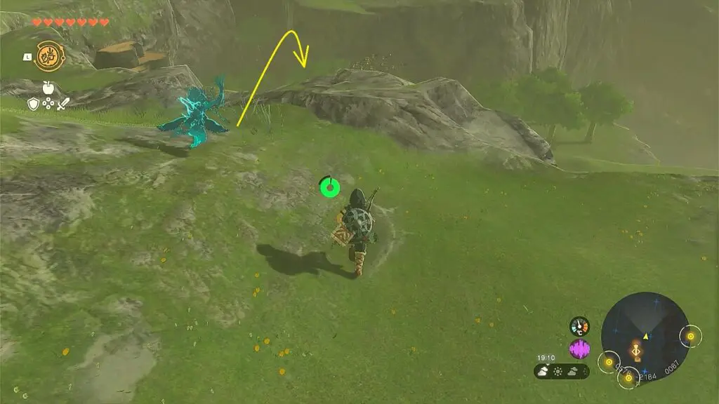 Use the ascend ability to go back up. Then go behind the tower and jump down the cliff as shown in the picture below. Now turn around and enter the cave as shown in the second picture below.