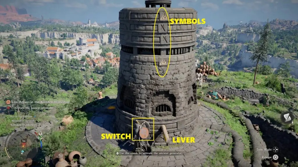 In front of the tower, you will see a yellow glowing switch/lever. Use this switch to choose which ring you want to move. After selecting a ring, use the wooden lever to rotate that ring. Keep rotating it until the glowing symbol in that ring matches the others (top/bottom) symbols. Do this for both middle rings. Once all the symbols match, the generator will turn on.