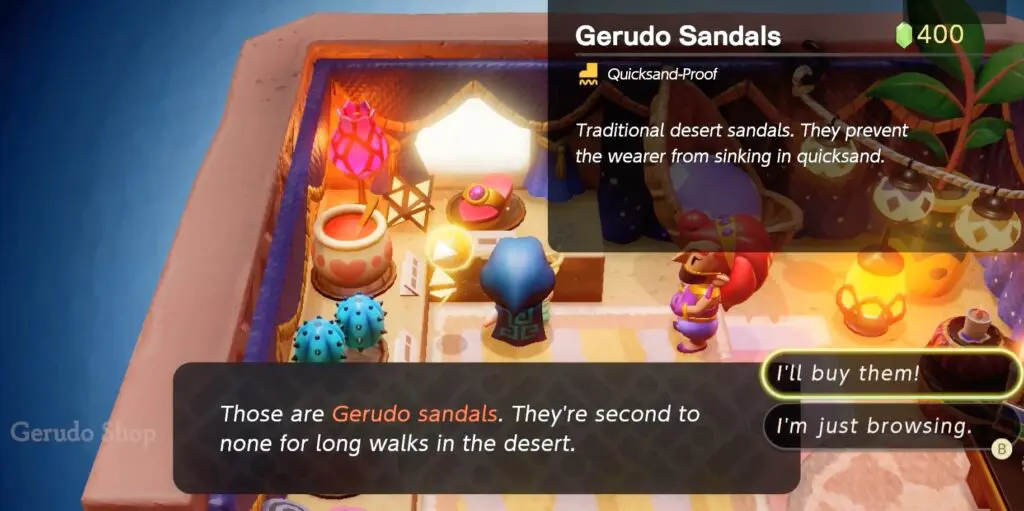 Purchase the Gerudo Sandals from Gerudo Sandals in Gerudo Town for 400. This Sandal prevents the wearer from sinking in quicksand.