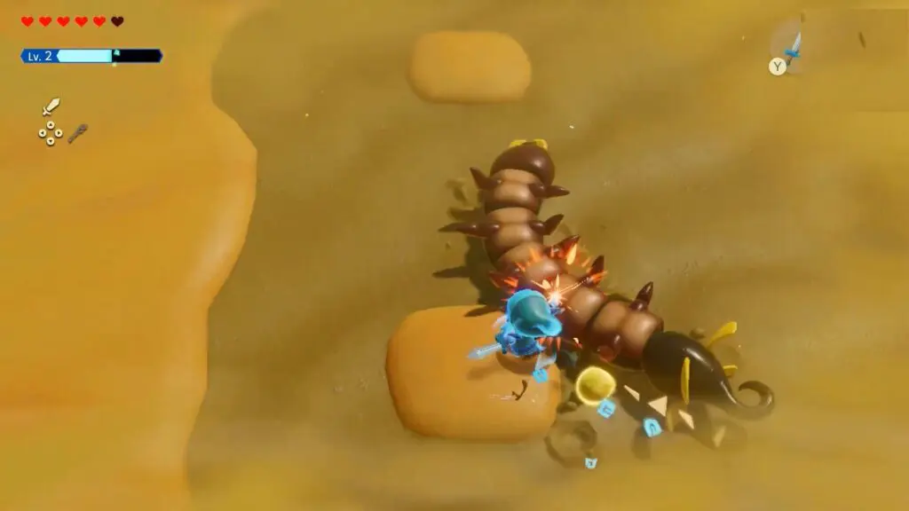 Go to the desert where you’ll see a big sandstorm. Walk into the sandstorm and look for a small stream of sand coming up from the ground. This is where a giant centipede will pop out to start the battle.