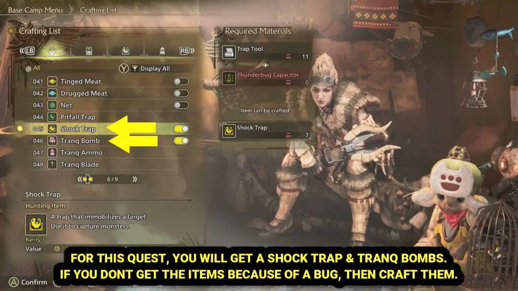Alma will give you two items—EZ Shock Traps and EZ Tranq Bombs to help you capture Yian Kut-Ku, as shown in below image.