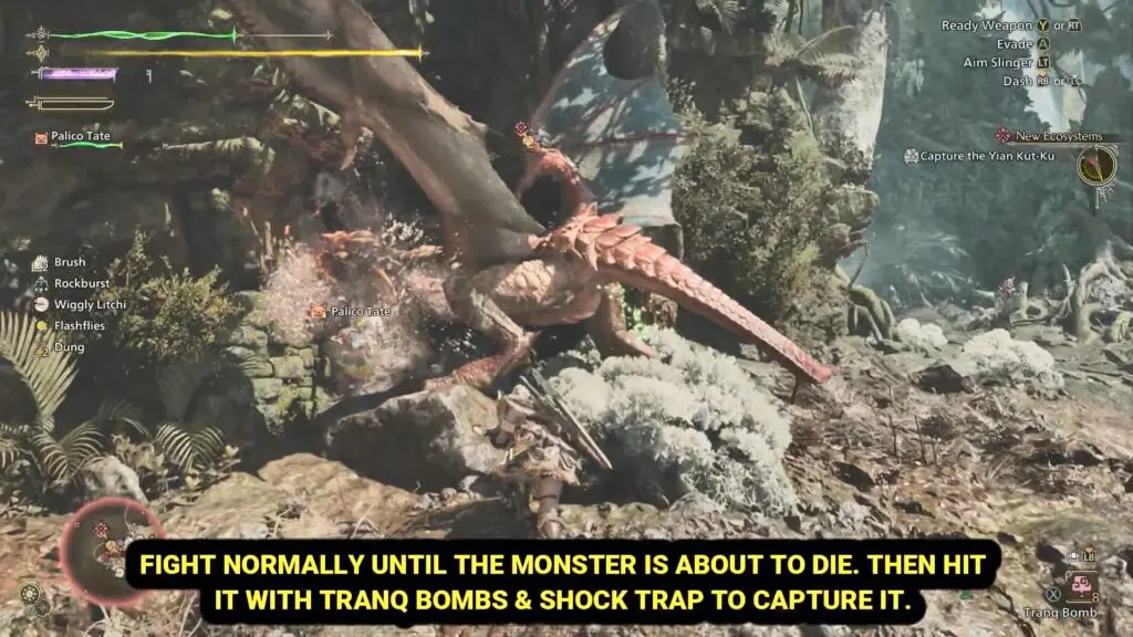 After getting these items, fight the monster as usual until it is very weak and about to die. When it has lost most of its health and is about to be defeated, first uses the EZ Shock Traps to capture the Monster. Once the Monster is trapped quickly throw EZ Tranq Bombs on the monster to capture the monster.