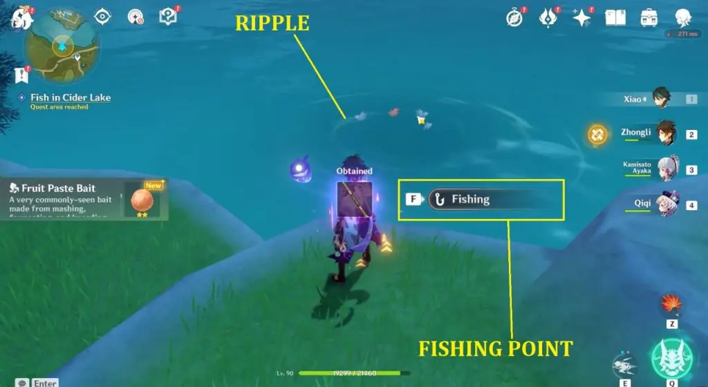 If you see ripples in a nearby water body, this means that it is a Fishing Point (prompt). Get close to the Fishing point and interact with it to start fishing. I have attached a screenshot for reference. Each fishing point will be refreshed every 3 days, during this period alteration between day and night will influence the appearance of fish.