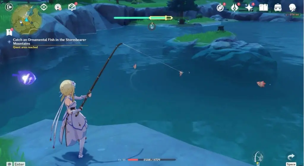 Select the appropriate Fishing Rod and bait. Hold the cast button to enter aiming mode. Let go of the said button to flick the bait and hook out. Once the fish is caught in the hook, the fish will start to struggle. Adjust the fishing line tension and keep it in the yellow ideal tension zone. Fishing progress will only increase if you keep the line tension in the ideal zone otherwise it will drop. Once the progress is full, you will have successfully caught the Ornamental Fish.