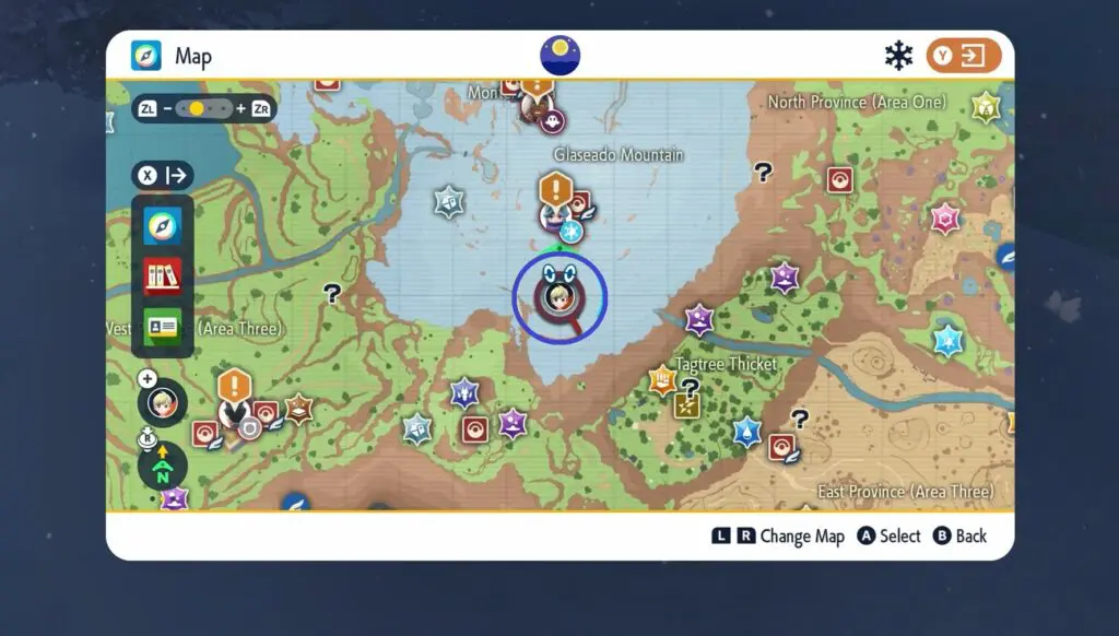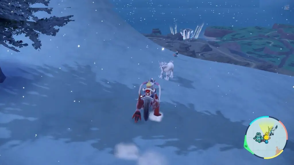 Glastrier is an Ice type of Pokemon and it can be found in Glaseado Mountain. Glastrier’s location is directly south of the Glaseado Gym. You can start at Glaseado Gym and glide south down the snowy mountain on Koraidon or Miraidonto and find the Ice-horse Pokemon standing on the slopes of the snowy mountain.