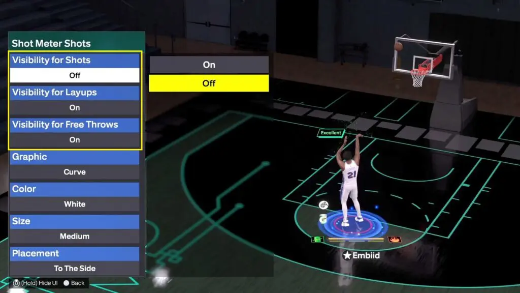 Inside the Shot Meter settings, go to Visibility for Shots and switch it to No. To fully disable the meter, you’ll also need to do the same for both Layups and Free Throws, setting their visibility to No as well. Once you’ve turned these off, your shot meter will no longer appear on-screen.