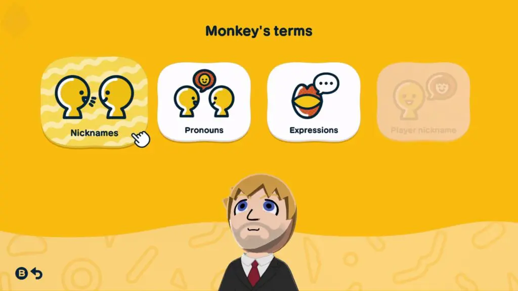With the character selected, press Y to bring up their options menu. From here, navigate to the Terms section. Inside this menu, you will find several options, including pronouns, expressions, nicknames, and more.