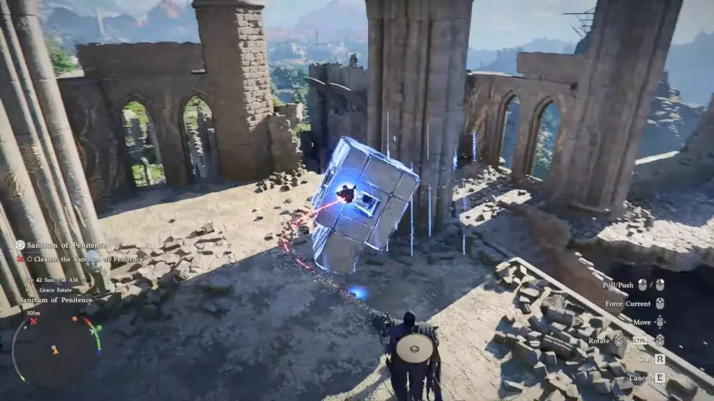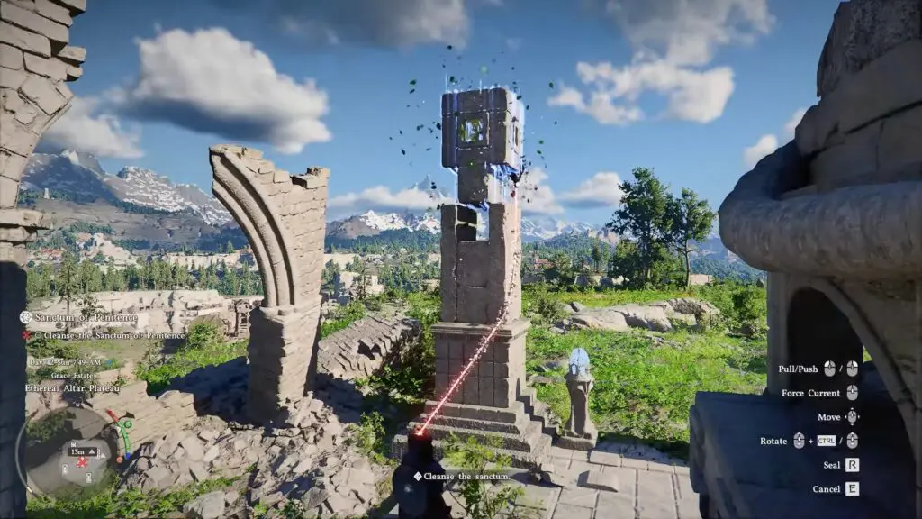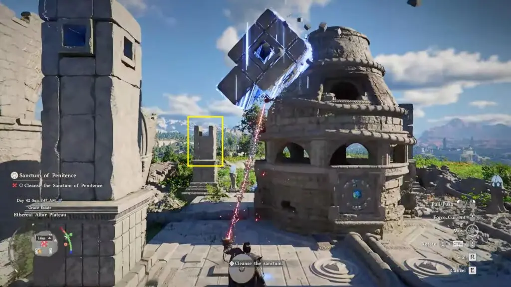 climb up to the top of the pillar, jump off, and use Force Palm while you are in midair so that it hits downward onto the piece. When it connects, the machine will power up, and the sanctum will be cleansed.