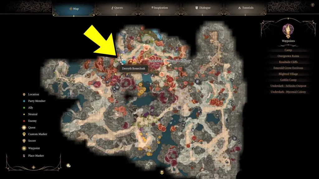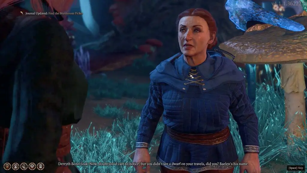 Talk to Derryth Bonecloak in the western part of Myconid Colony within the Underdark. Refer to her location on the map below. During your interaction, she will reveal that her spouse has encountered difficulties during a mushroom-gathering event. She asks for your help in locating him and returning him home.