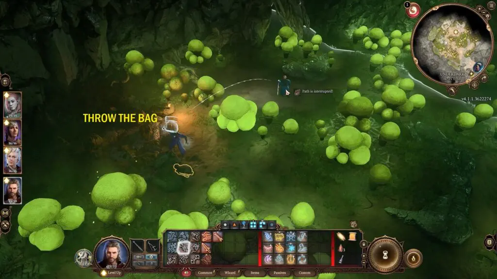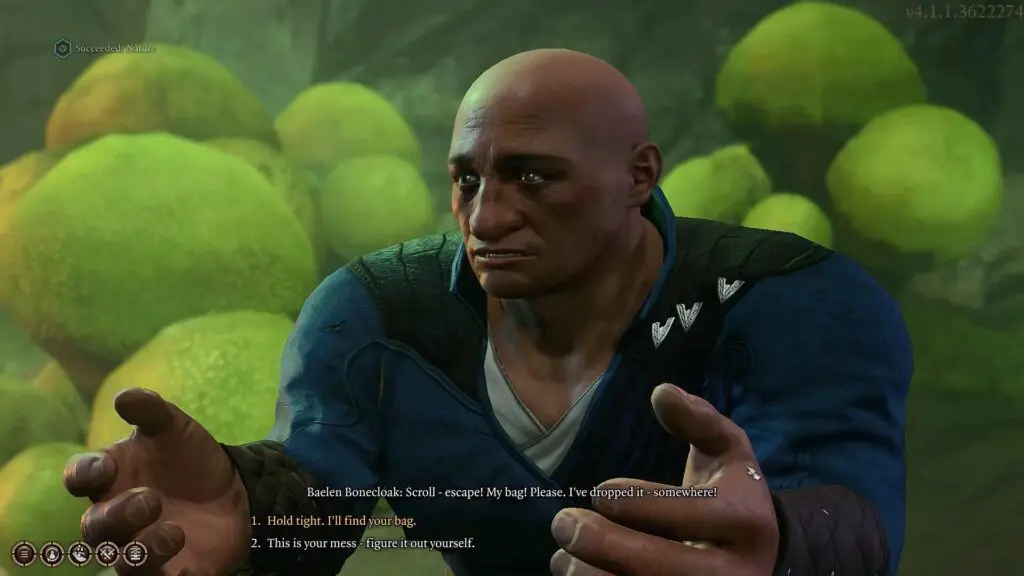 Keep an eye out for Baelen in the back as you approach the patch of bibberbang mushrooms. He’ll instruct you to stop moving and explain that he’s caught in the patch and can’t get out without setting them off. He goes on to tell that his bag contains a Scroll of Misty Step which he could utilize to escape if he could reach it.
