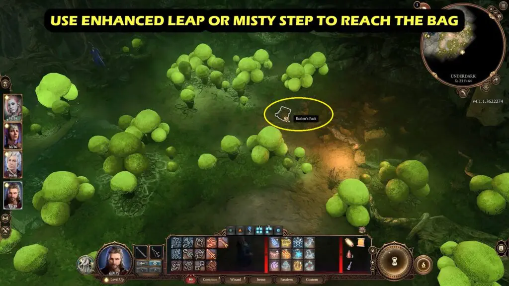 To begin, go to Turn-Based mode so your party does not follow you. Use Misty Step Spell to teleport to the little open space to the left of Baelen where you’ll find his backpack on the floor. If you don’t have Misty Step, choose a character with a long dash range or a long jump ability.