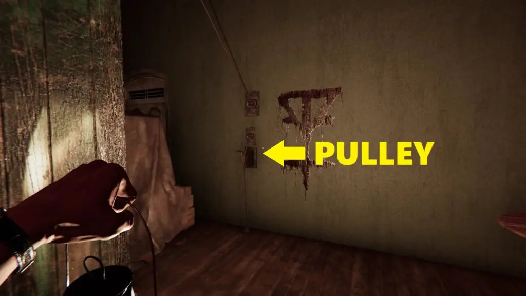 - Lower the cross: Victor has to bring the hanging cross down. Use the pulley to lower the hanging cross. Pulley is fitted on the stage wall as displayed in the image.