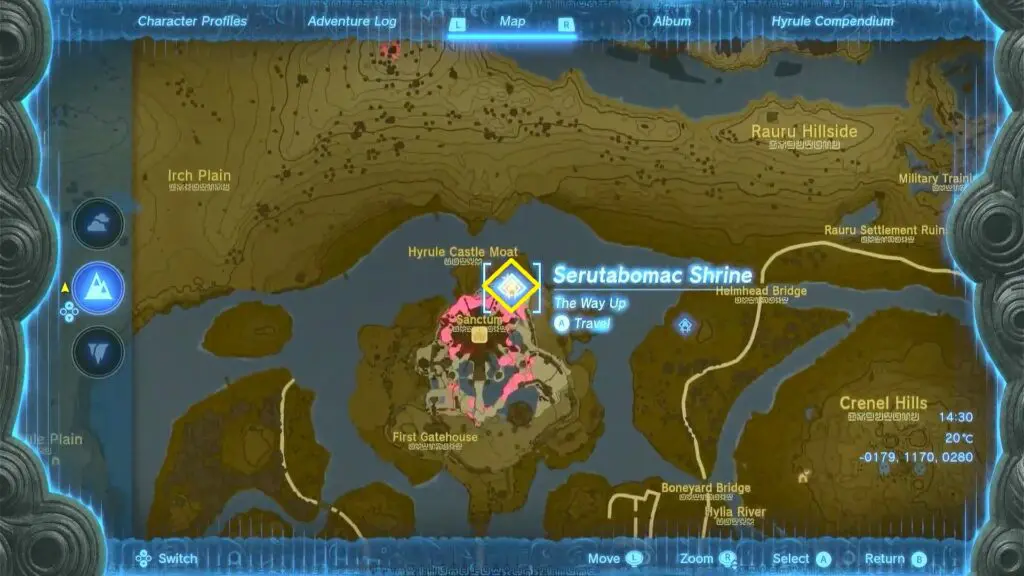 This guide shows how to complete the Serutabomac Shrine in the Legend of Zelda: Tears of the Kingdom, released on 12th May 2023. Serutabomac Shrine in The Legend of Zelda: Tears of the Kingdom is located in the Central Hyrule Region on the northeast side of the Hyrule Castle island.
