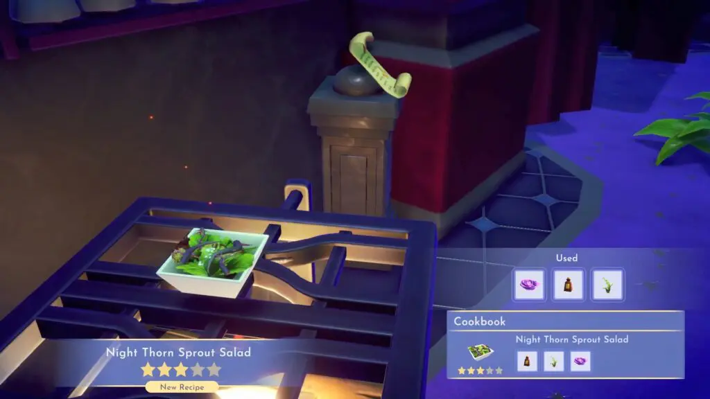 The second door is named “Doorine” and will only open after being fed a quest-exclusive dish – Night Thorn Sprout Salad. The second floor will provide you with a table of ingredients, and a cooking station.