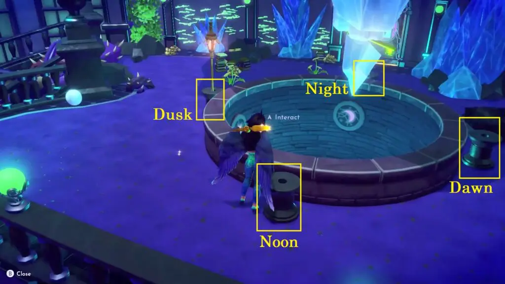 Look at the interior of the well, and ensure that you correctly position the torches on the stands corresponding to the appropriate pictures representing the respective time of day. Place the torches in this order counter-clockwise: Dawn, Noon, Dusk, Night.