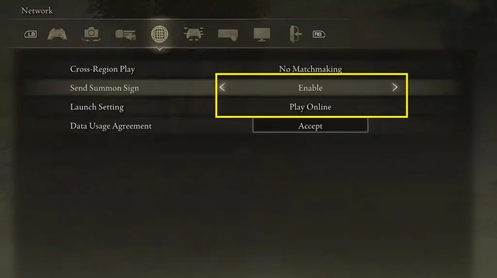 Enden Ring has a 4-Player co-op option. Although playing Co-op in Elden Ring is different from other games. It’s not as simple as inviting your friends on Steam. For Coop, you will be needing special items. But first, enable your network setting as shown in the picture below. Open the main menu, go to settings and there go to the network Tab. Make sure that “Send Summon Sign” is enabled and the Launch Setting is “Play Online.