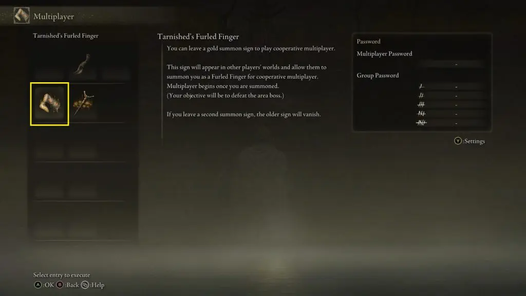 Select Tarnished’s Furled Finger to leave a summon sign anywhere you want. If you want only your friend to see your summon sign, then set a password. Only a person using the same password will be able to see your summon sign.