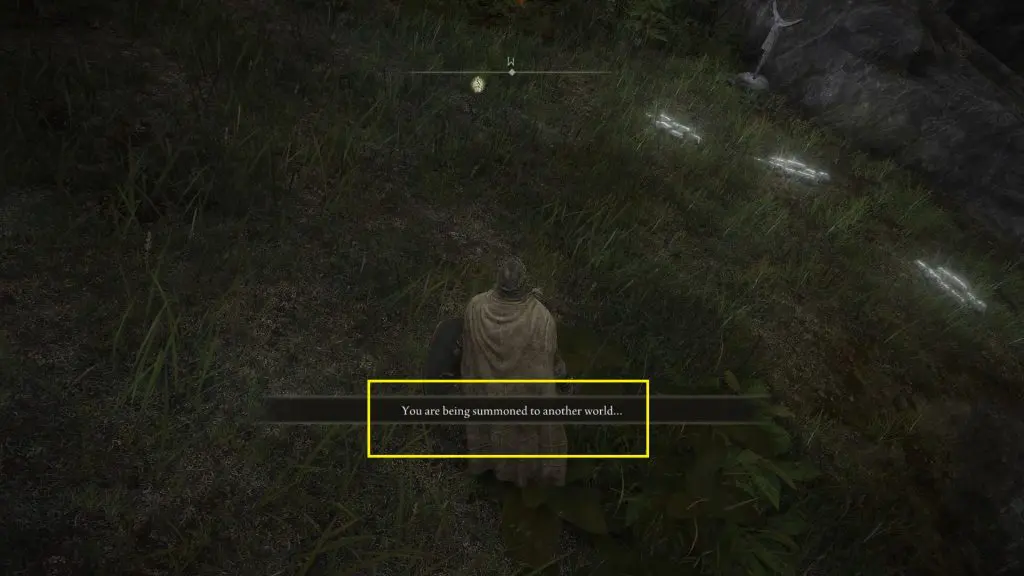 The summon sign you place can be seen in golden color as shown below. Inform your friend about the location of the sign, and they can accept your join request. Anyone else who sees your summon request can also accept it. Once your summon request is accepted, you will get a notification as shown in the second picture below. Please remember that if you beat a boss in someone else’s game, it won’t be counted in your game. You will need to summon players to your game if you want help in beating a boss.