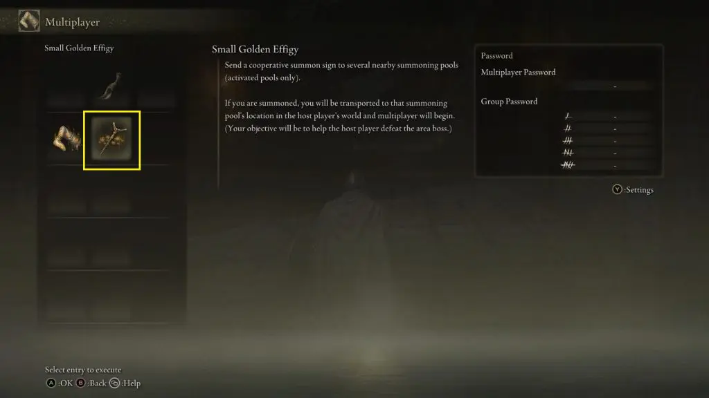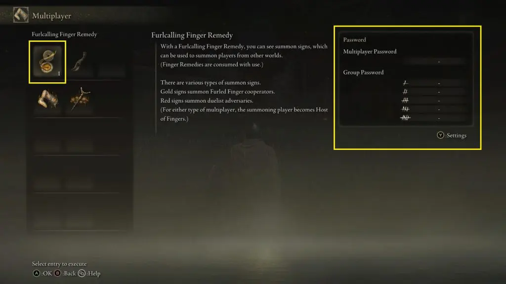 Once you have a Furcalling Finger Remedy, on the multiplayer menu and use one. This will make all the summon signs that other players have placed appear in your game (See the second picture below). You can go near any golden summon sign and accept anyone’s request to join your game. Usually, you will find many summon signs near the summon pool. Now any boss you defeat in the coop will progress your game further. If you want to play only with your friend, then make sure to set a password. Only the summon signs from the players using the same password will appear in your game. Along with the yellow signs, you will also find red signs in the game. The red signs are from the players who want to PvP.