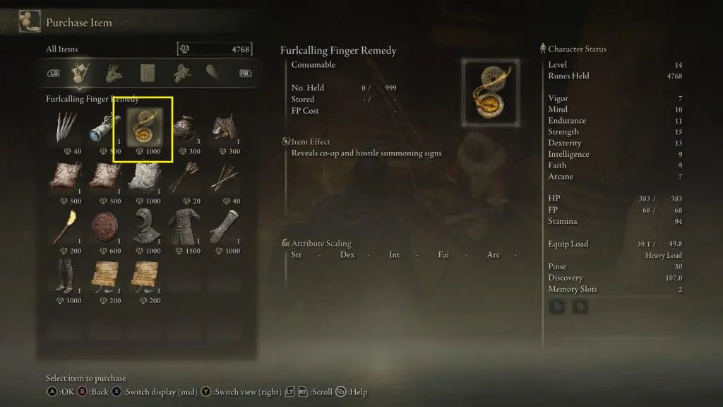 You can purchase Furcalling Finger Remedy, from the vendor inside the Church of Elleh for 1000 Runes as shown in the pictures below.