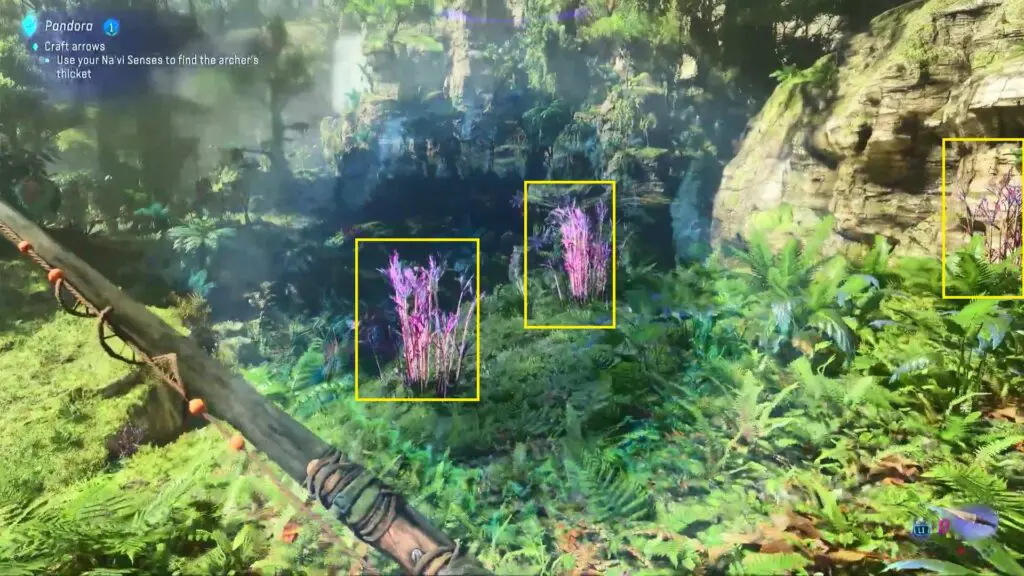 To make arrows, you must first gather Archer’s Thicket (sticks). To find Archer’s Thicket grab the long grass shown in the image below. Archer’s Thicket grass is tall and violet in color. The player can use their Na’vi senses to find Archer’s Thicket.