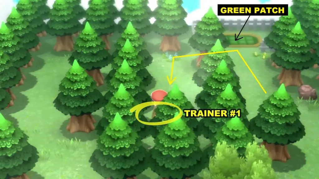 Now go back to the green patch. From there go south until you see three trees with light green colored leaves on the right side as shown in the picture below. Trainer 3 is behind these three trees.