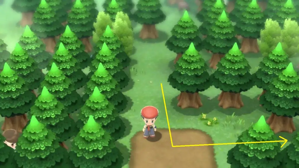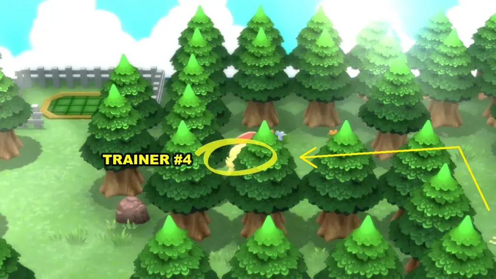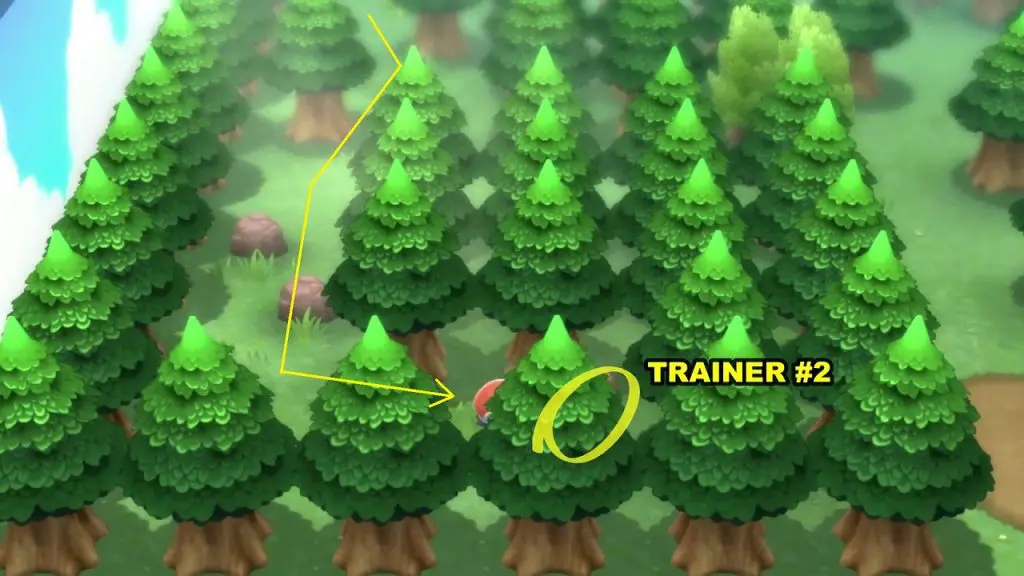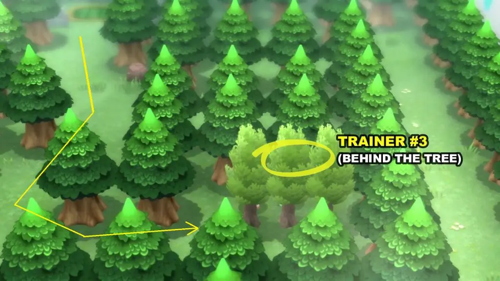 After defeating Trainer 1, proceed to the southwest side. Go to the end of the path, where you will find the trainer behind some trees as shown below.
