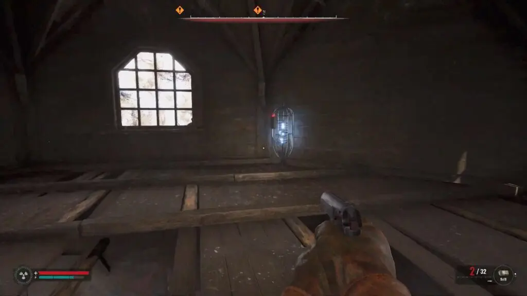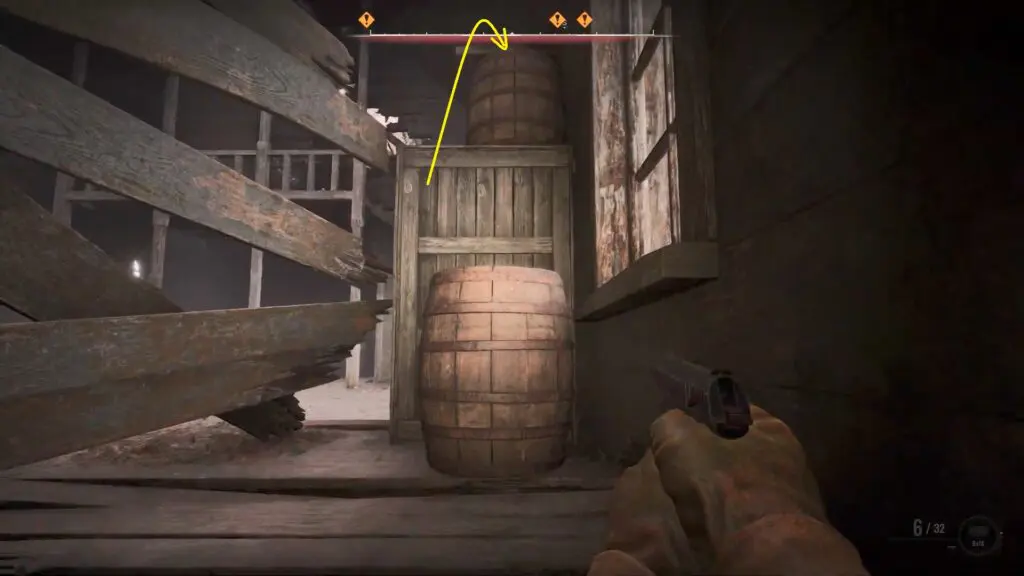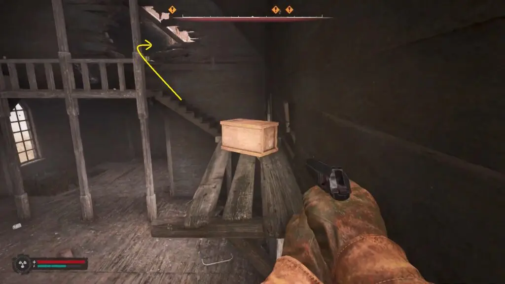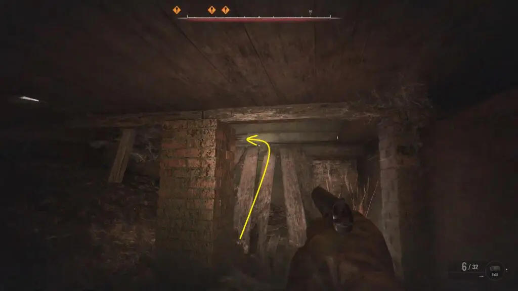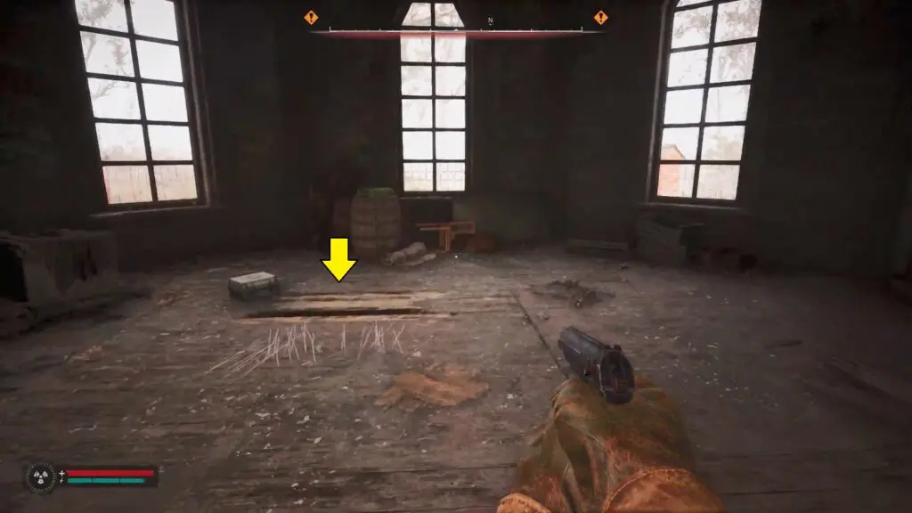 Head inside the old church and proceed to the left side to find a yellow mark on the wooden floor. Break the floor and drop down.