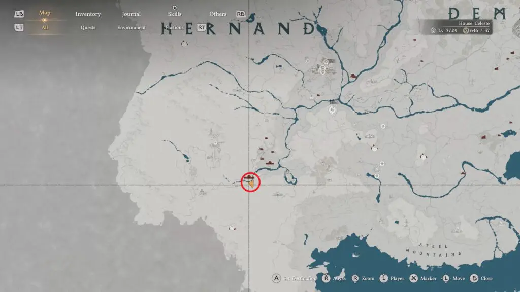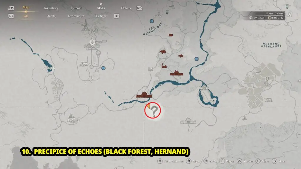 The Precipice of Echoes Ruins is located in Hernand, in the Roberts Estate area, south of Fort Perwin. It shows up on your map as a Mysterious Energy icon.