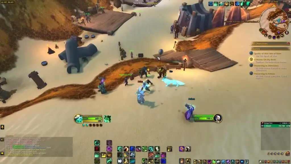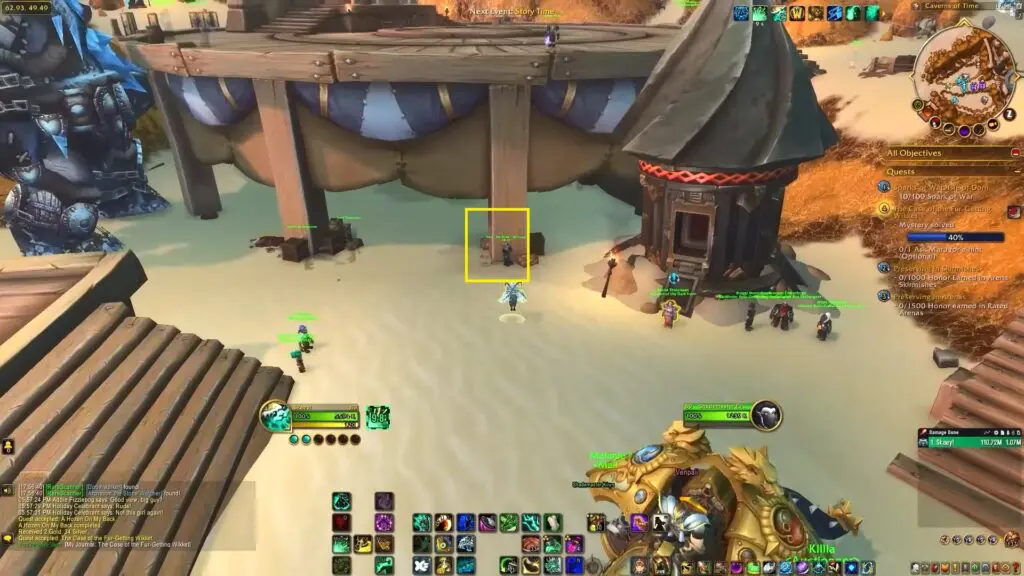 Speak with Alyx at the main tent of the Caverns of Time to pick up the quest – A Hozen On My Back. She is wearing a white dress and is the Volunteer Assistant Guest Relations Manager.