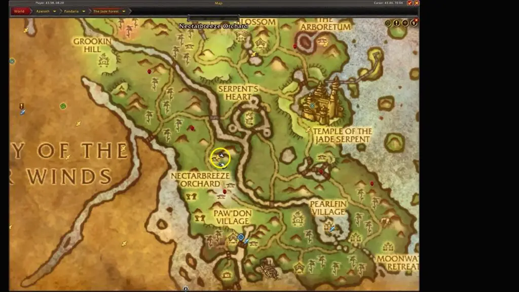 In The Jade Forest, make your way to Serpent’s Overlook and locate the large orange tree on the mountainside. Refer to the location below.
