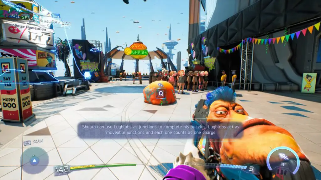 Now, to enter the HumanCon, you must solve a small electric spike puzzle to open the front door. Start by going upstairs and then look at the top of the tower to find a Lugblob. There is also a junction on the same tower. Use Gus’s vacuum ability to bring it down and place it near the locked door. This Lugblob can work as a junction, which is needed to complete the circuit.