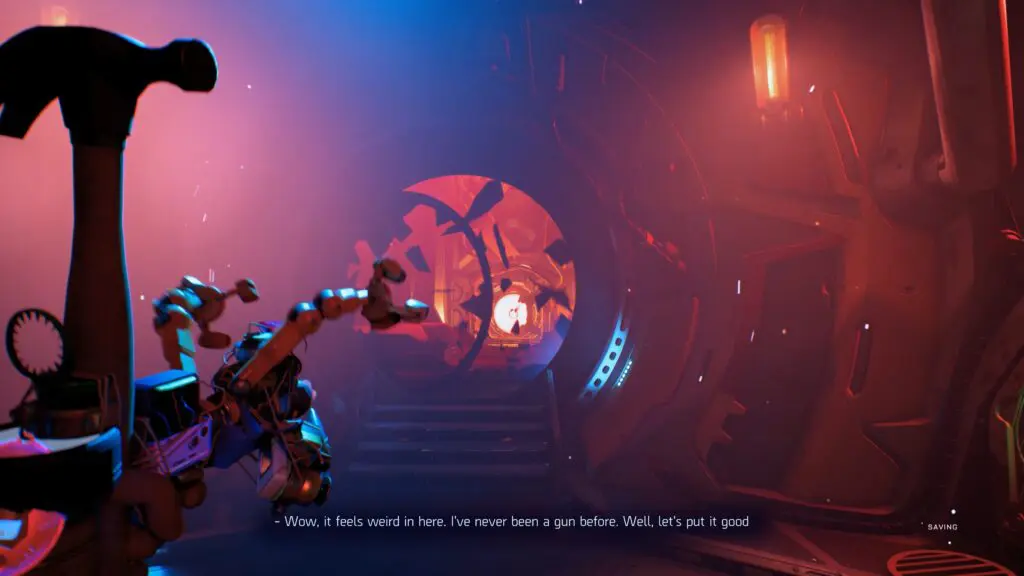 Use the hammer to break both the hands of the Suit-O’s to get arms for the gun.