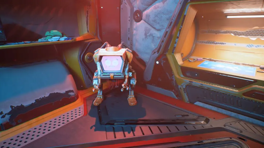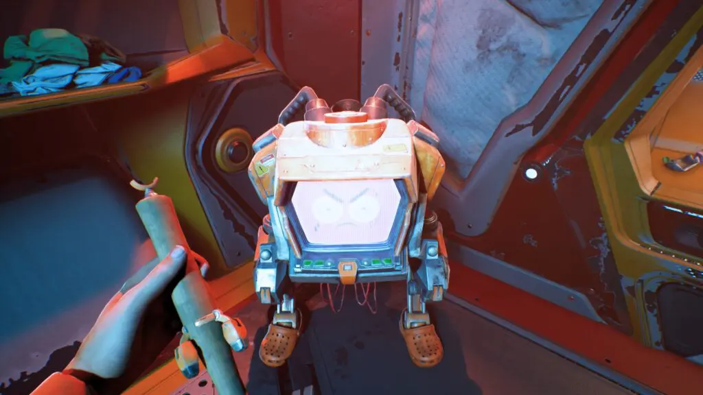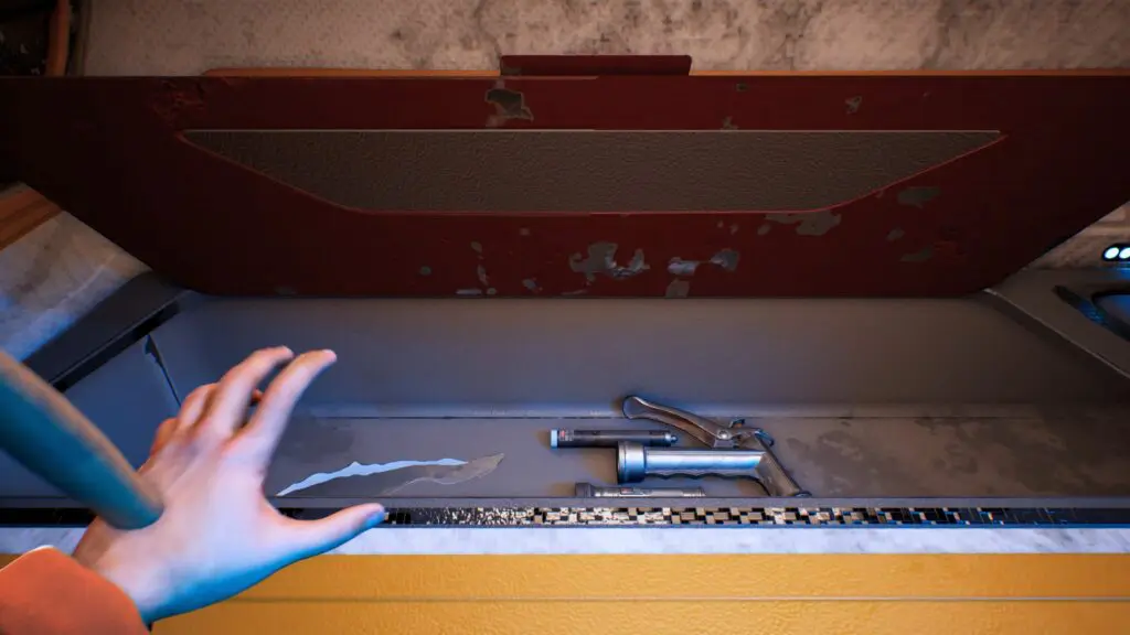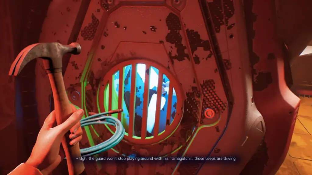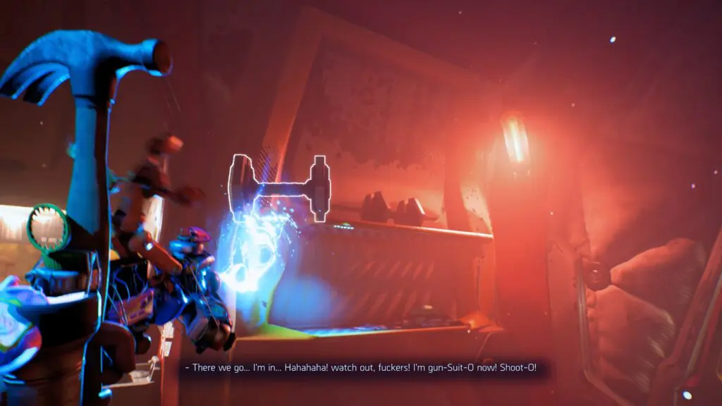 Once you have collected all the items, craft the gun and insert Suit O’s chip. After that, pick up any object in the room and throw it at the door to break it open and escape the prison cell.
