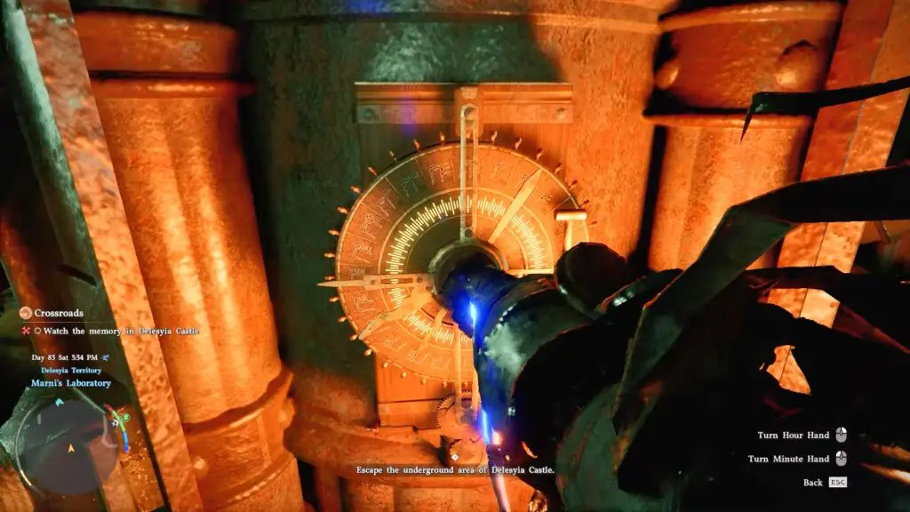 The clock has an hour hand and a minute hand, which makes it look like you need to set a specific time. But the solution is actually much simpler than that. Hold L1 and R1 together (LB and RB on Xbox) at the same time and keep holding them in. When the hands stop moving, hold the buttons in again. Keep repeating this until the machine turns blue. This will pull you into Visione Mode, where you will watch the memory fragment play out.