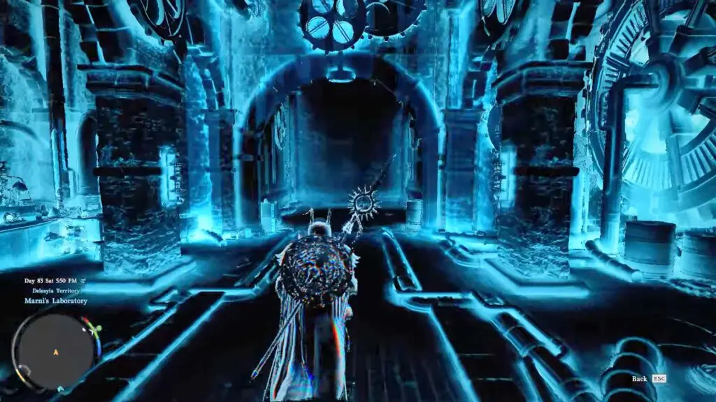 Move forward toward the machine in front of you and push the lever to the left. This will reveal a hidden clock inside the machine. Before you interact with it, make sure you are wearing the Visione Helmet. Once it is on, walk up to the machine and interact with the cog to connect to the clock.