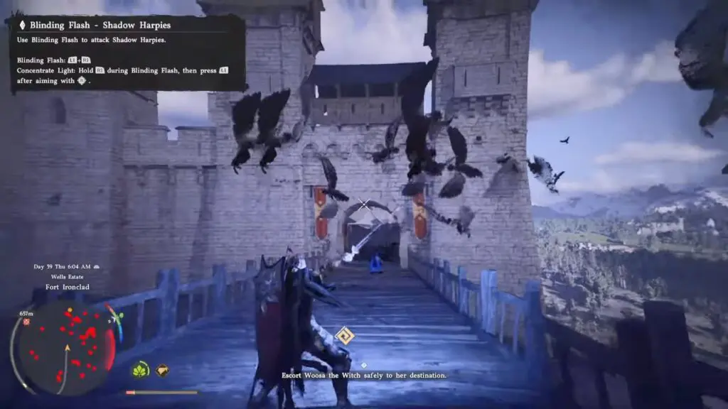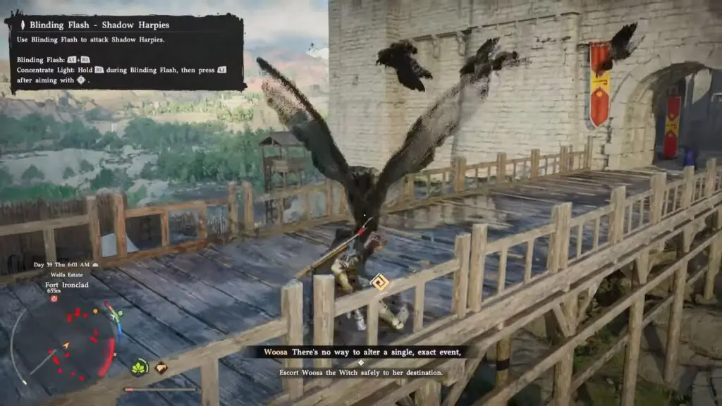 Near the bridge, you will spot a few birds up in the sky. Hold L1 and R1 at the same time to shine your blades, then tap L1 to reflect light toward the birds. This will clear the first group around the bridge. Keep in mind that a few birds will also directly attack Woosa, so make sure you deal with those as well before moving on.