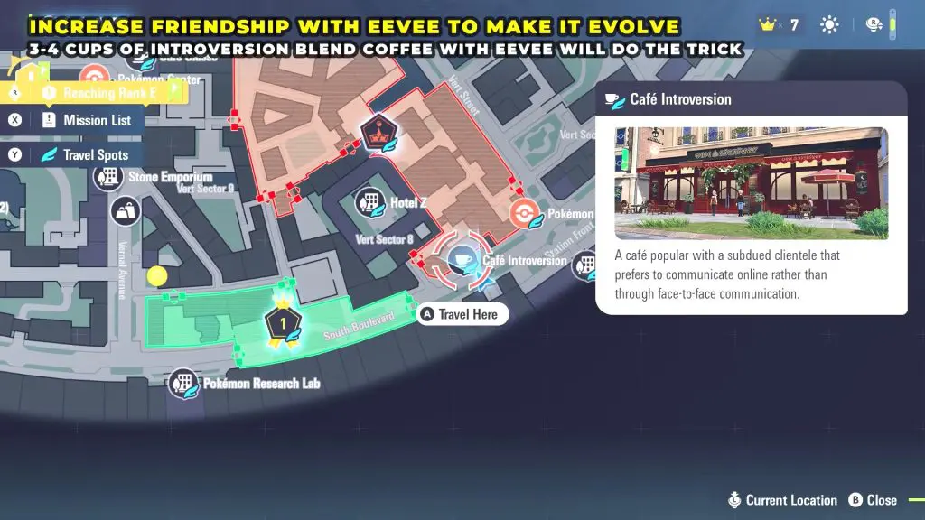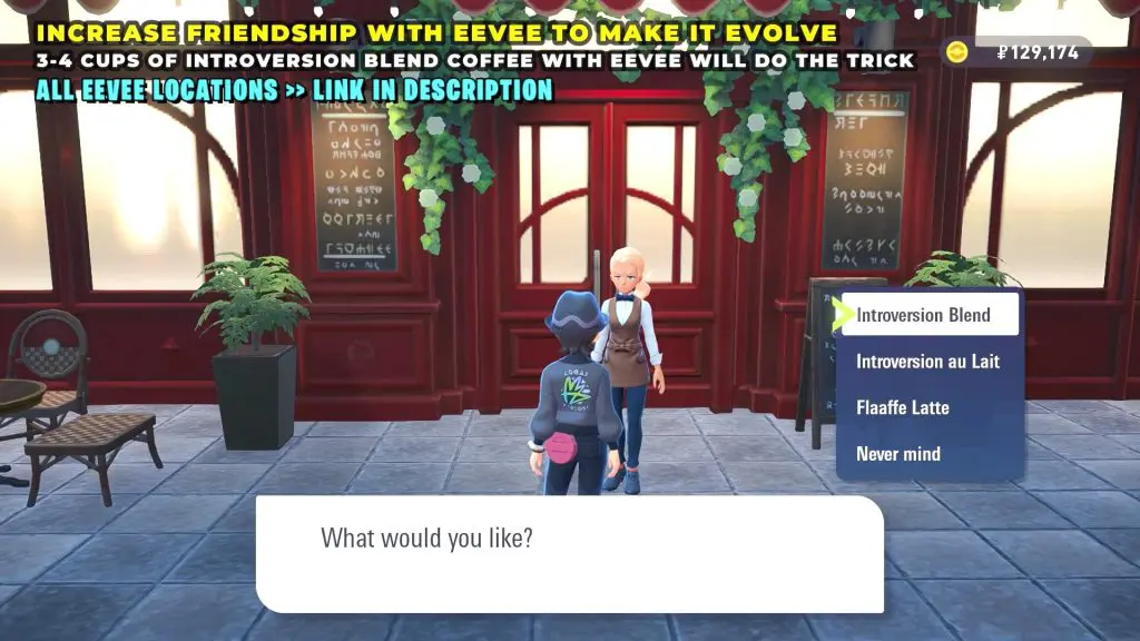 Eevee evolves into Espeon during the daytime when its friendship level is high. To raise friendship, spending time with Eevee, like visiting cafés, also helps it grow closer to you faster. For example, you can visit a coffee shop and have 3–4 cups of the Introversion Coffee Blend with Eevee. This helps increase its friendship level much faster.