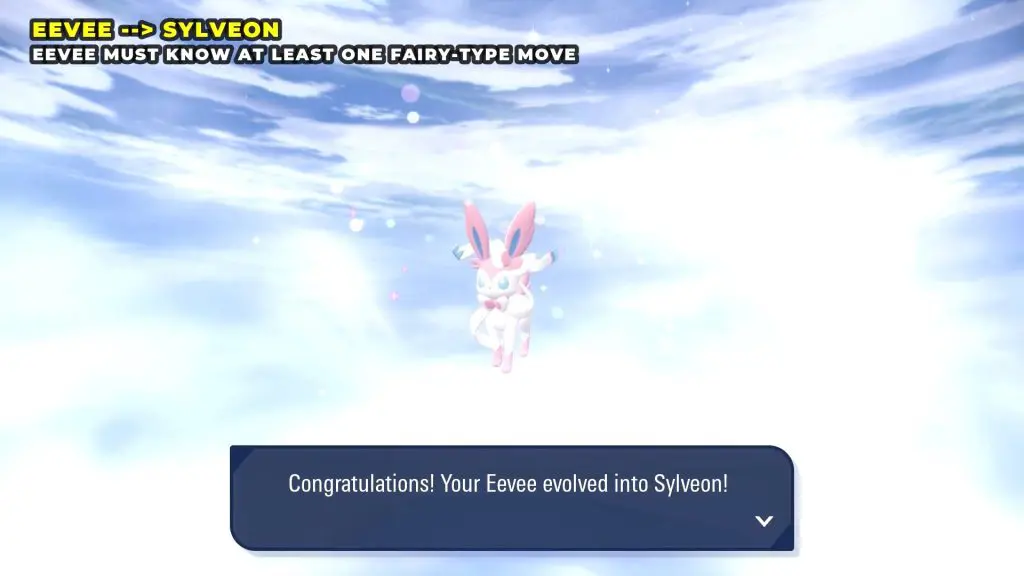 Eevee evolves into Sylveon when its friendship level is high and it knows a Fairy-type move. Like Disarming Voice, a Fairy-type move.